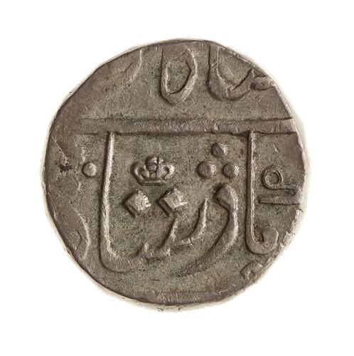 The Surat mint was closed in 1815 but its name was retained at Bombay which had differentiated its product with small privy marks. The privy marks were continued after the closure of the Surat mint and in 1825 the new feature of the AD date incuse on a plaque was introduced. The reason for this was to mark a change in the silver level of the coins. It was discovered in October 1824 that the silver trial plates at Bombay were incorrect as a result of which all silver coins struck there since 1800 contained a tiny fraction too much silver. From 1825 this was remedied. The date 1825 became another frozen date appearing on all silver coins until 1831. The privy mark on this coin was used from 1825 until 1831.