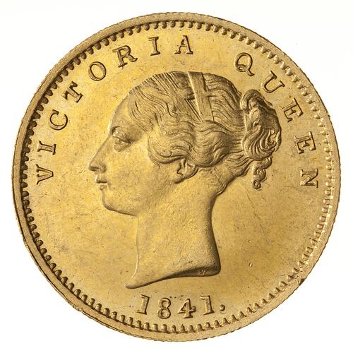 This gold mohur continues the tradition of its predecessor (the mohur of William IIII which bore the frozen date 1835). Now showing the head of Queen Victoria, the new coins bear the frozen date 1841 and were not legal tender. Legal tender was the silver rupee, the value of the gold mohur in rupees varied with the relative market prices of gold and silver. However, from 13 January 1841 Treasuries were ordered to accept the mohur at the original 1835 fixed rate of 15 rupees.