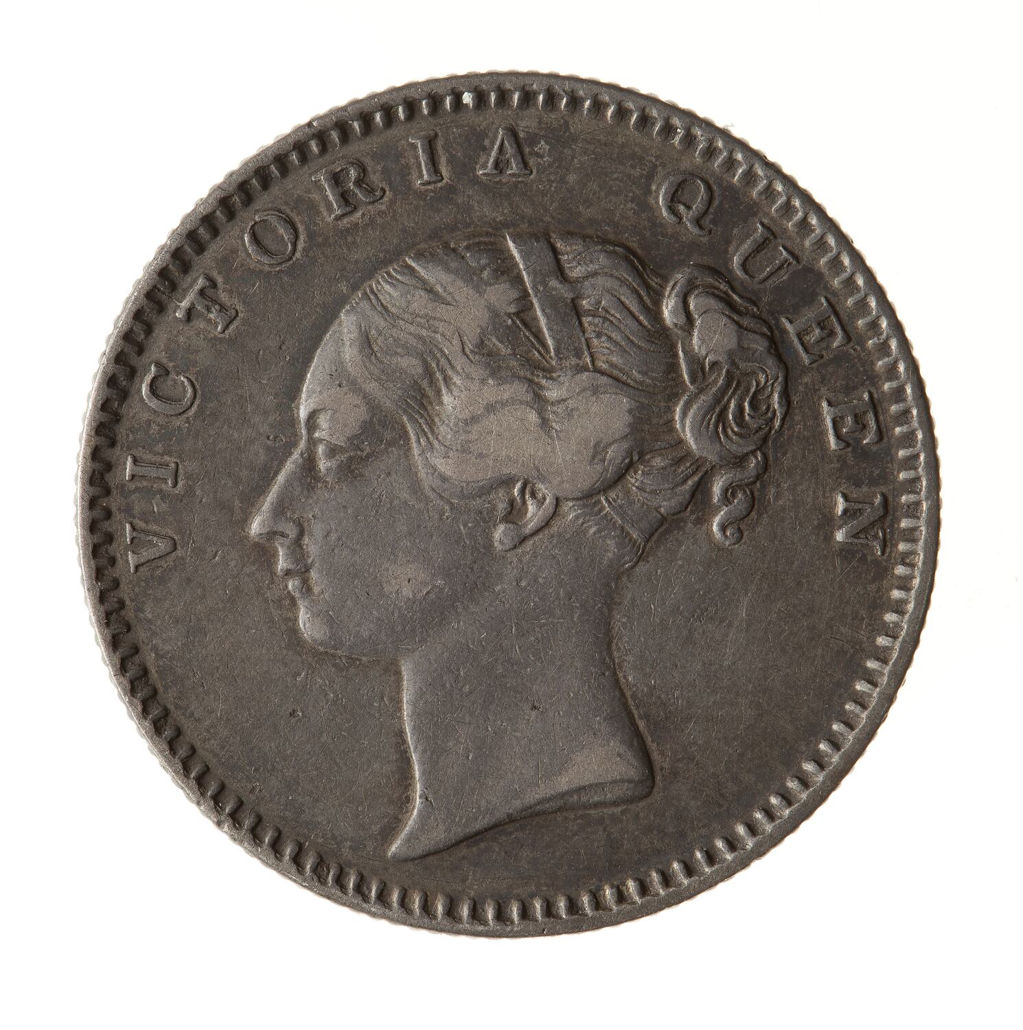 A round silver coin (25 mm). The obverse features a young head of the Quen facing left; around above, VICTORIA QUEEN. The reverse has at the centre within an olive wreath, 1/2 RUPEE then a line in Arab script; around, EAST INDIA COMPANY 1840.