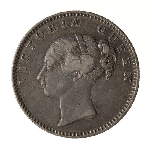 Bare head of the queen facing left; around above, 'VICTORIA QUEEN'.