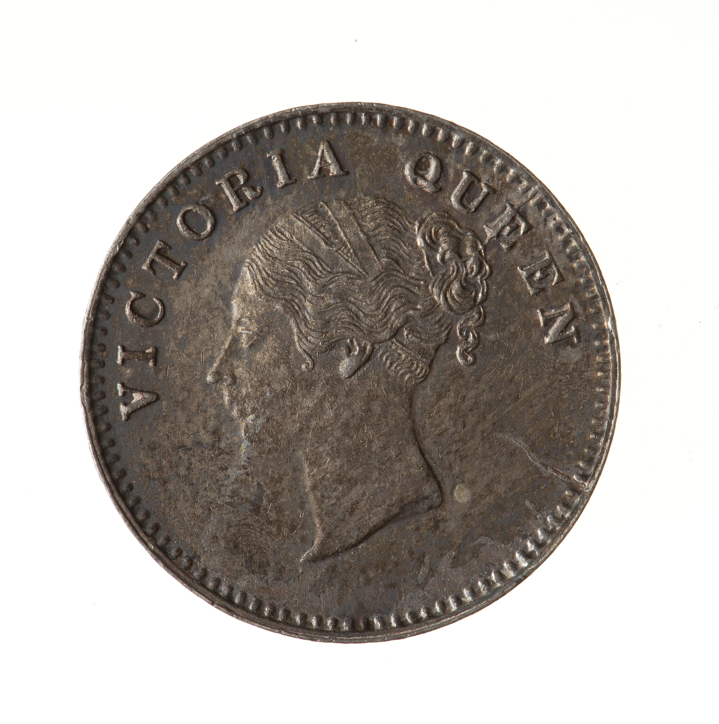 A round silver coin (15 mm). The obverse features a young head of the Quen facing left; around above, VICTORIA QUEEN. The reverse has at the centre within an olive wreath, TWO / ANNAS then a line in Arab script; around, EAST INDIA COMPANY 1841.