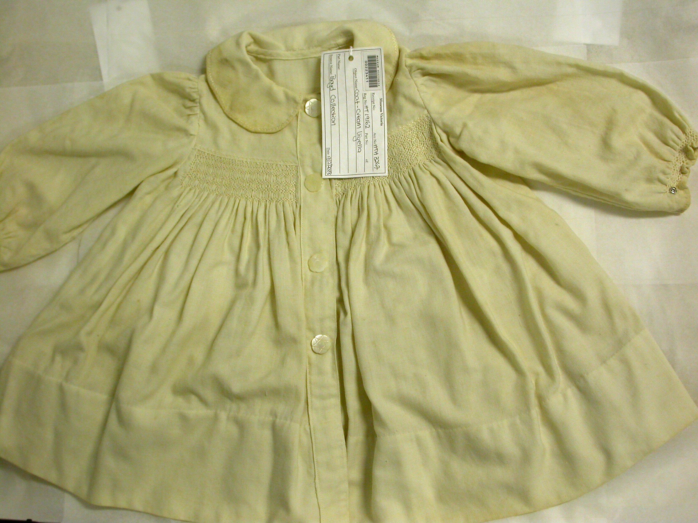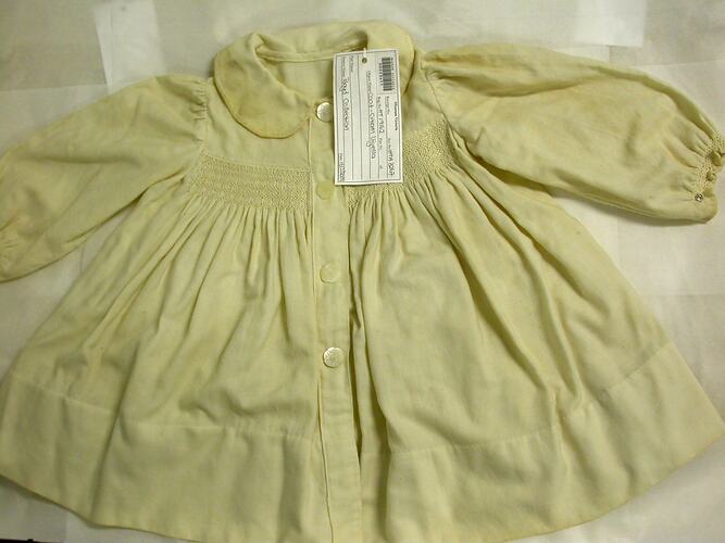 Infant's cream 'Viyella' coat with long sleeves and front stud opening. Peter pan collar and smocking to bodice and sleeves.