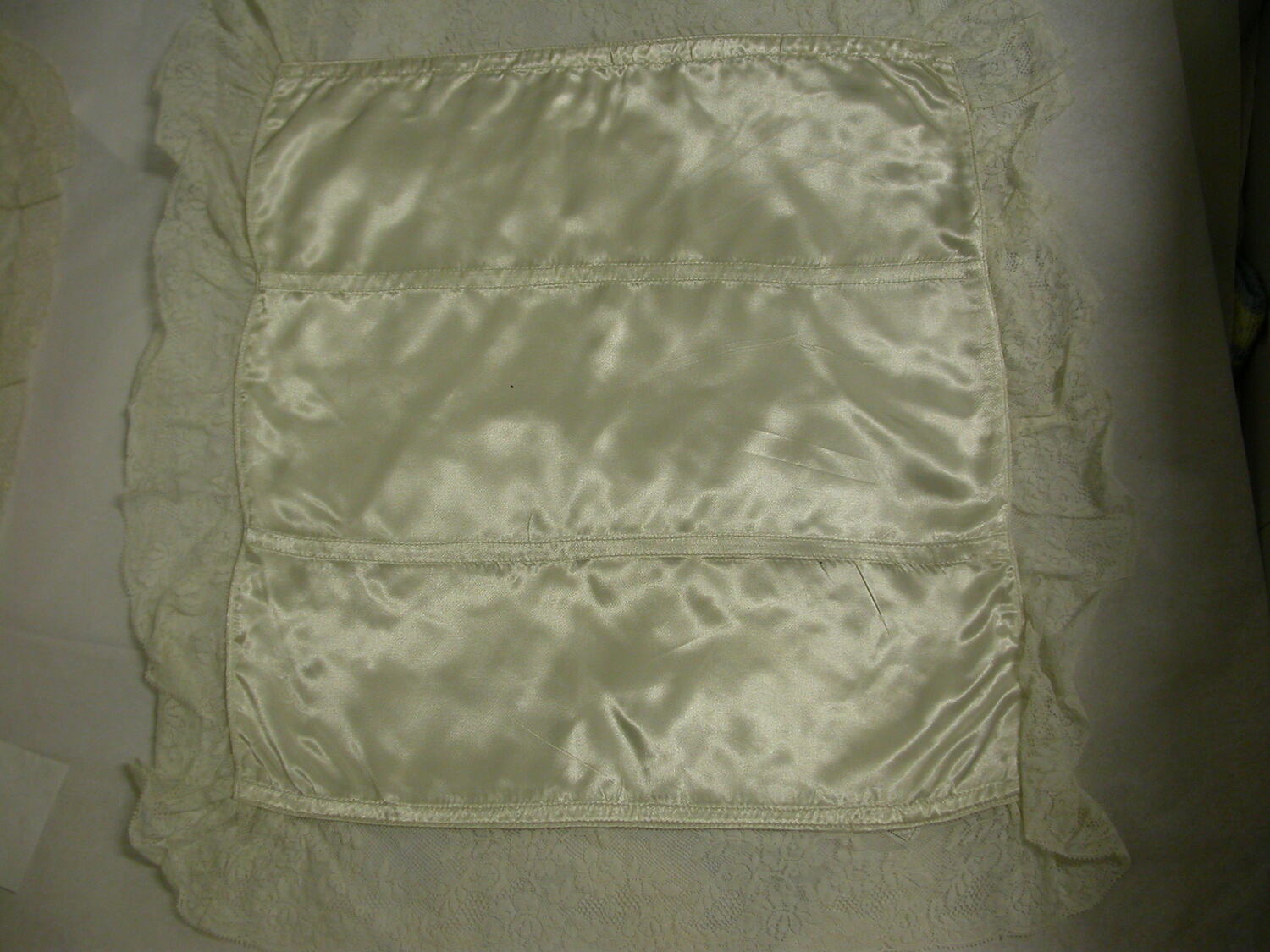 White satin pillowsham with lace trim.