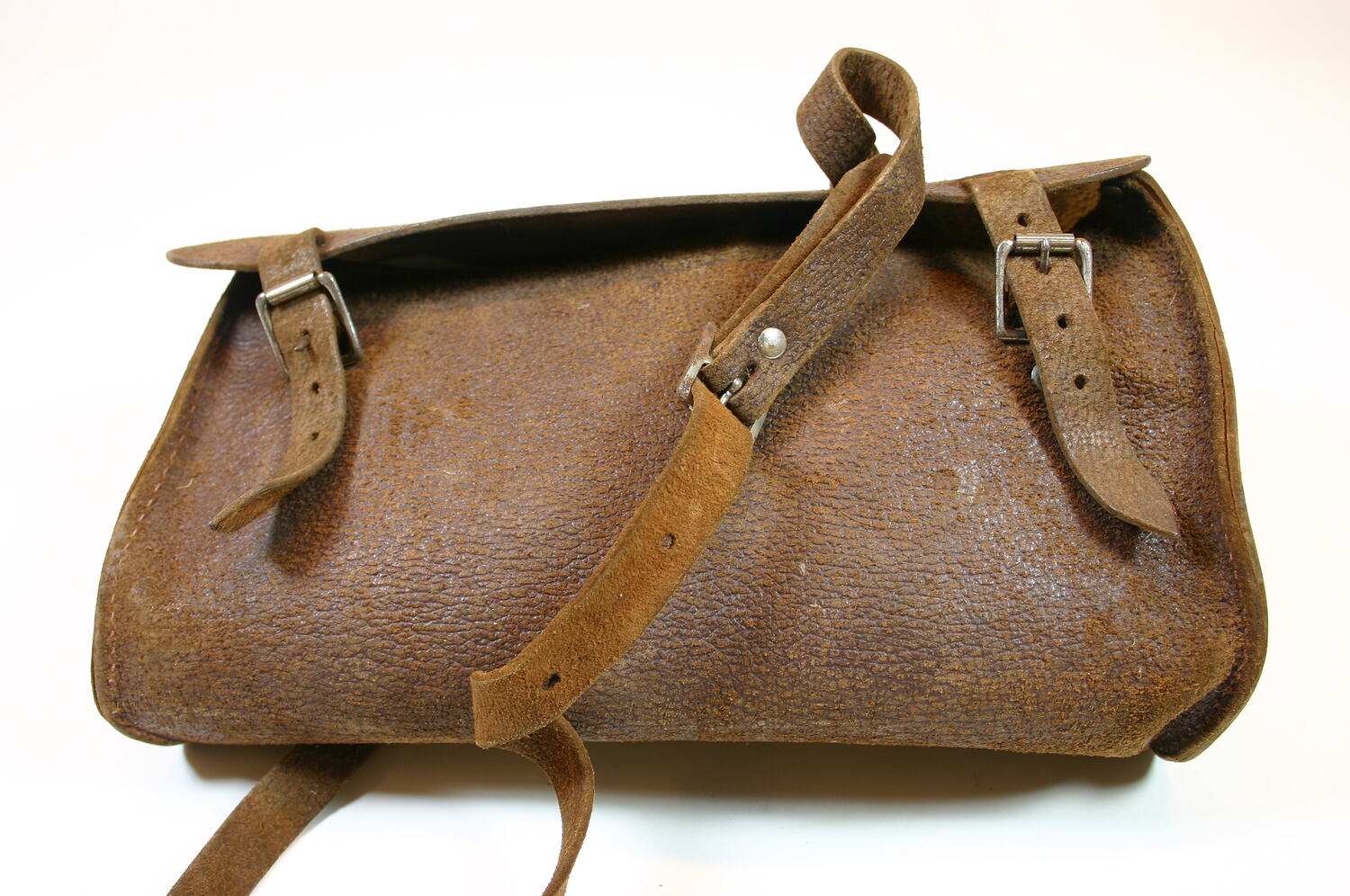 Brown leather school satchel with single shoulder strap and metal buckle fastenings.