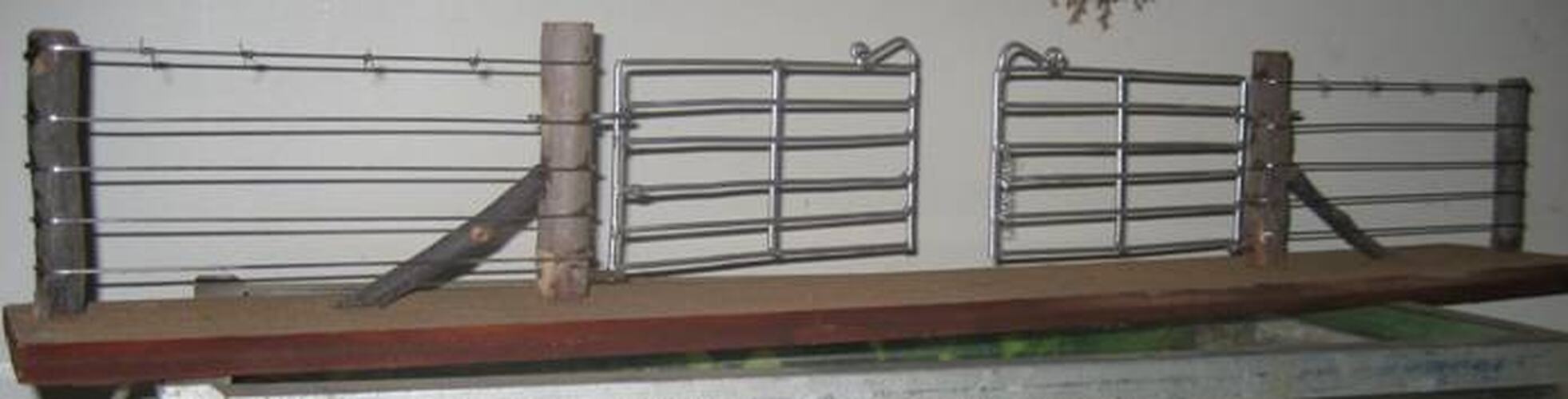 Model of double farm gates and barbed wire fencing. Constructed from wood, wire and mallee dirt.