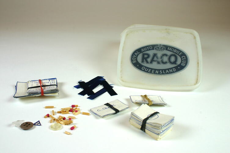 Broken match sticks, buttons, short pieces of blue ribbon and pieces of hand written paper Secured with rubber bands.These items are housed in a plastic Tupperware container with RACQ sticker on lid.