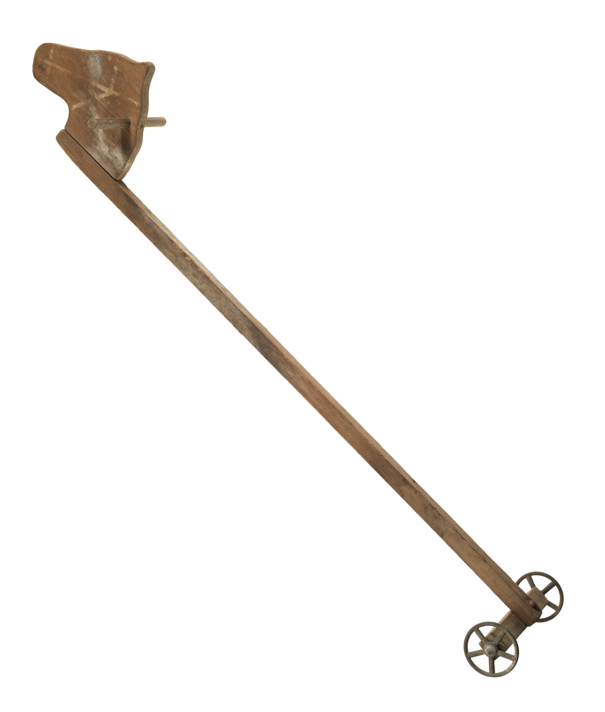Wooden hobby horse, improvised, home - made shaped horse head with dowel hand holds, with square shaft and two small metal wheels on wood axle.