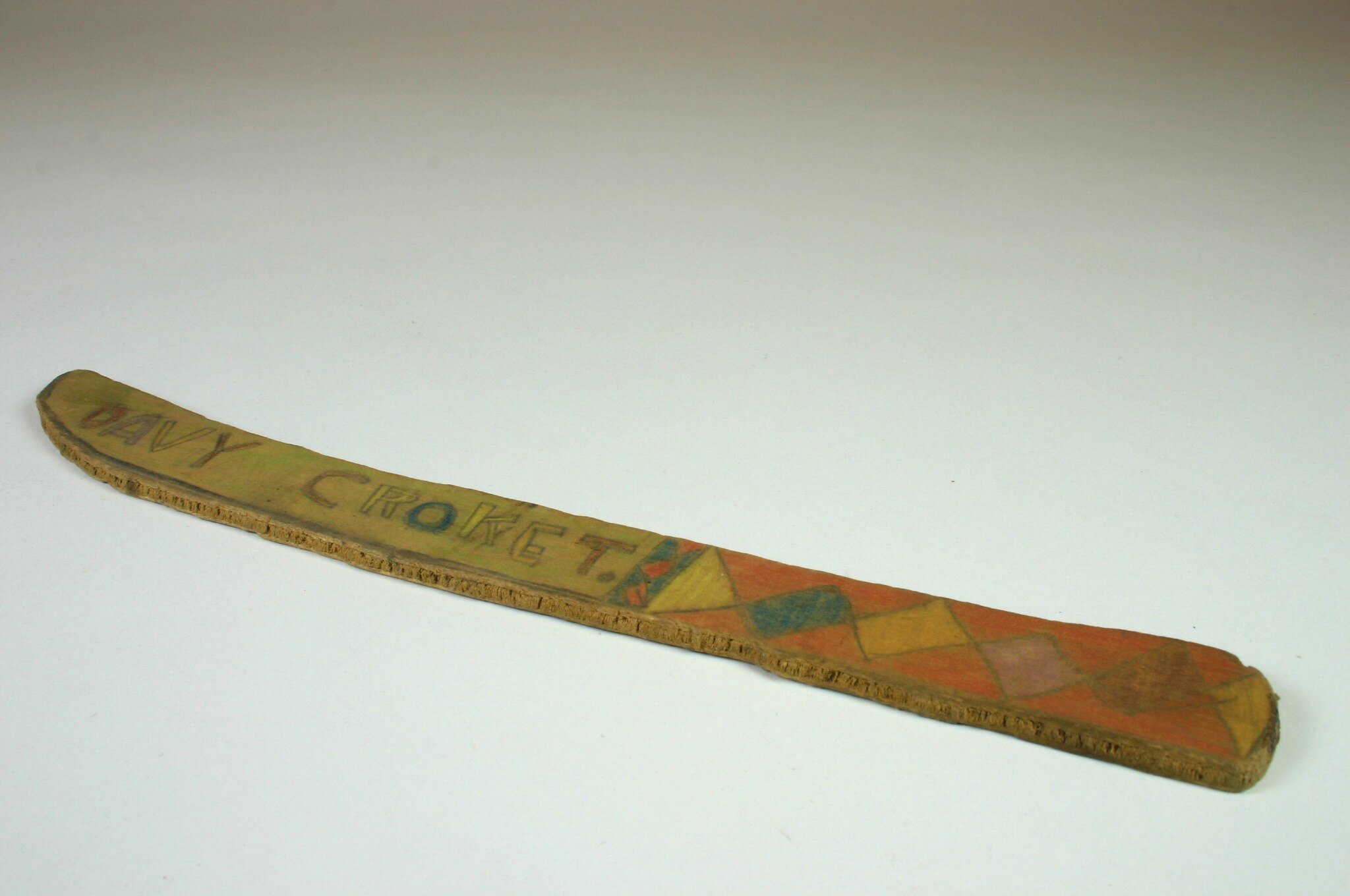 Hand-made plywood knife decorated with pencil. Used and owned by Bill Boyd in the 1950s.