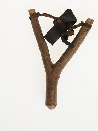 Y-shaped wooden slingshot/catapult made from the branch of a tree with stiff and broken leather sling still attached. Two spare slings one old and stiff; the other is as new.