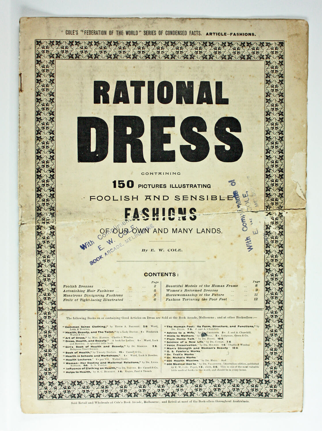 Text, printed, front cover: COLE'S "FEDERATION OF THE WORLD" SERIES OF CONDENSED FACTS. ARTICLE-FASHIONS./RATIONAL/DRESS/CONTAINING/150 PICTURES ILLUSTRATING/FOOLISH AND SENSIBLE/FASHIONS/OF OUR OWN AND MANY LANDS. Stamped, front: With Compliments/E.W. COLE,/BOOK ARCADE, MELBOURNE.