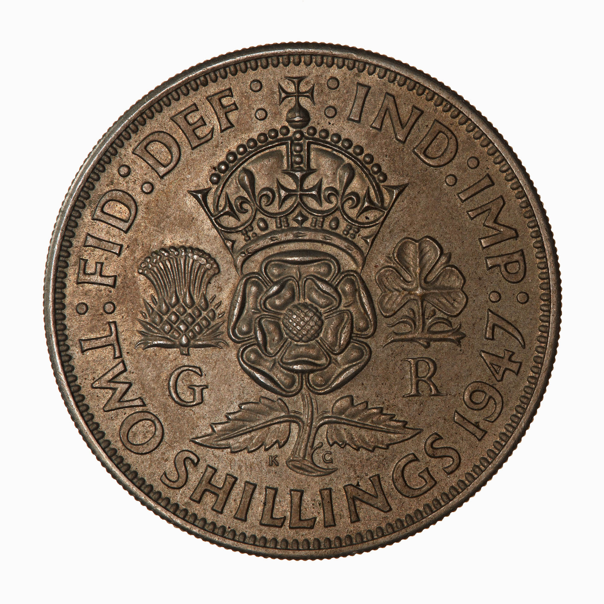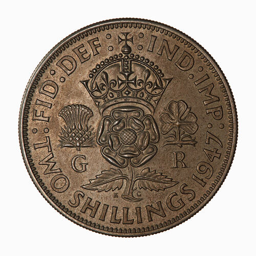 A crowned rose dividing a thistle above the letter G and a shamrock above the letter R; around above, FID: DEF: IND: IMP:; around below,TWO SHILLINGS 1947.