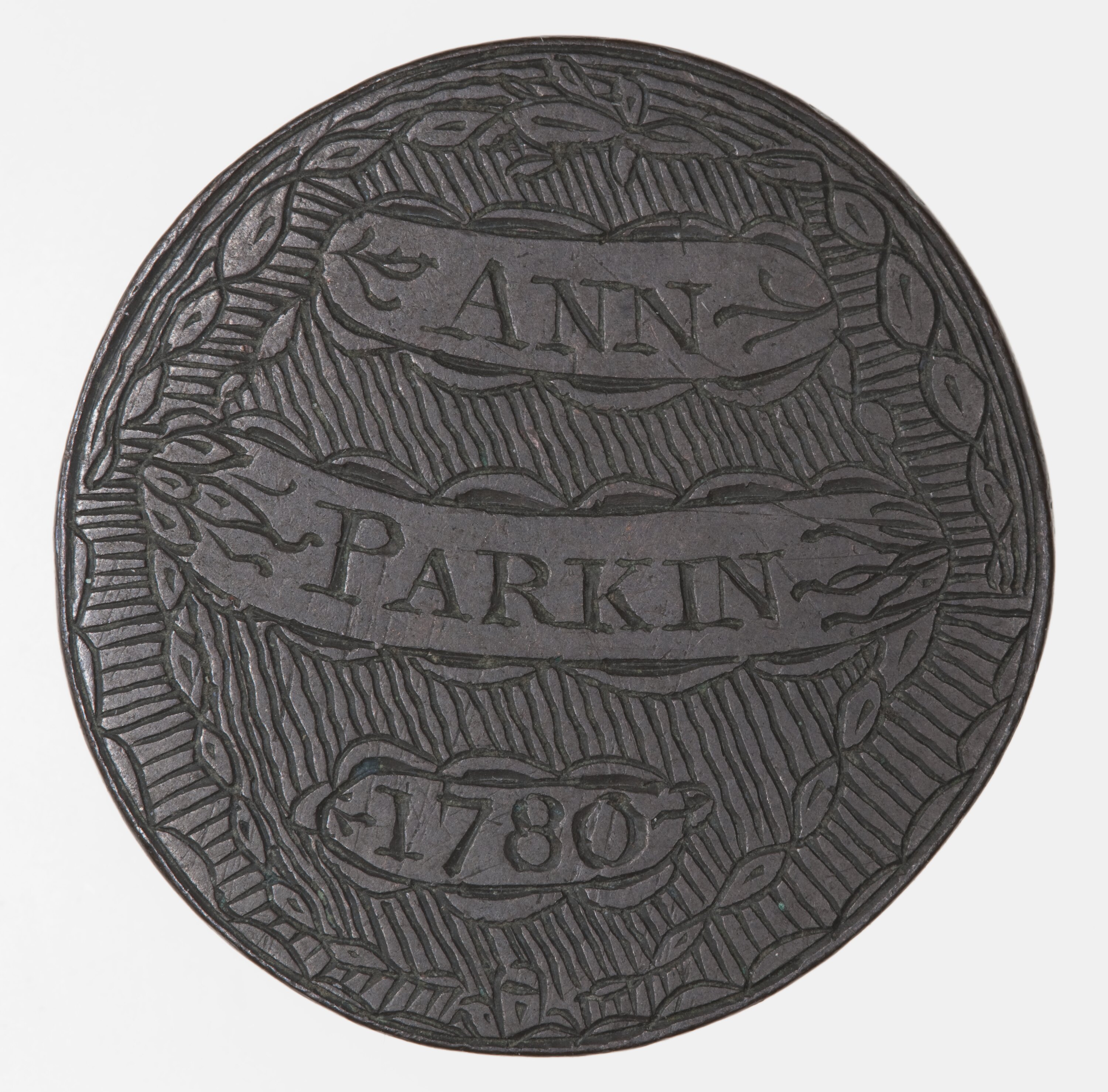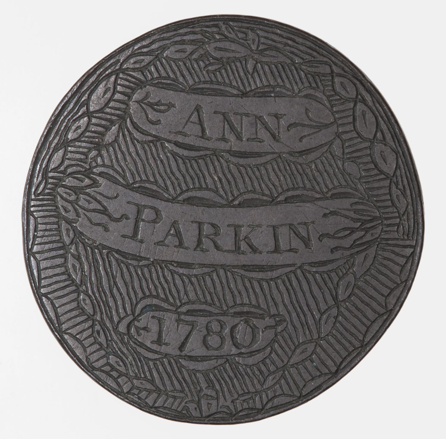 The reverse of the coin has been removed and engraved ANN / PARKIN / 1780 among leaves and lines.