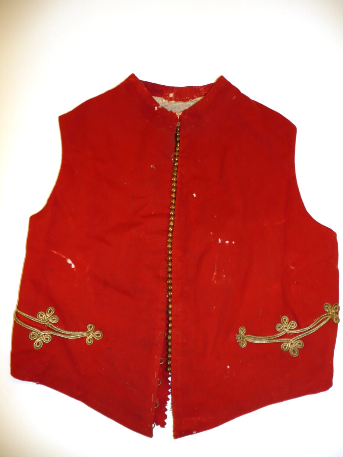 Scarlet, closed fronted waistcoat with short stand collar and pointed fronts. Collar and fronts decorated with gold lace. Welt pocket on each front trimmed with gold braid that forms a crowsfoot and eye at each corner and a crowsfoot above and below. Left front has a row of small pointed gilt studs and the waistcoat is fastened with alternate brass hooks and eyes on each front. Triangular panel of cotton fabric inserted into back seam. Straps on back same fabric as waistcoat, with brass buckle. Waistcoat fully lined with cream cotton twill.