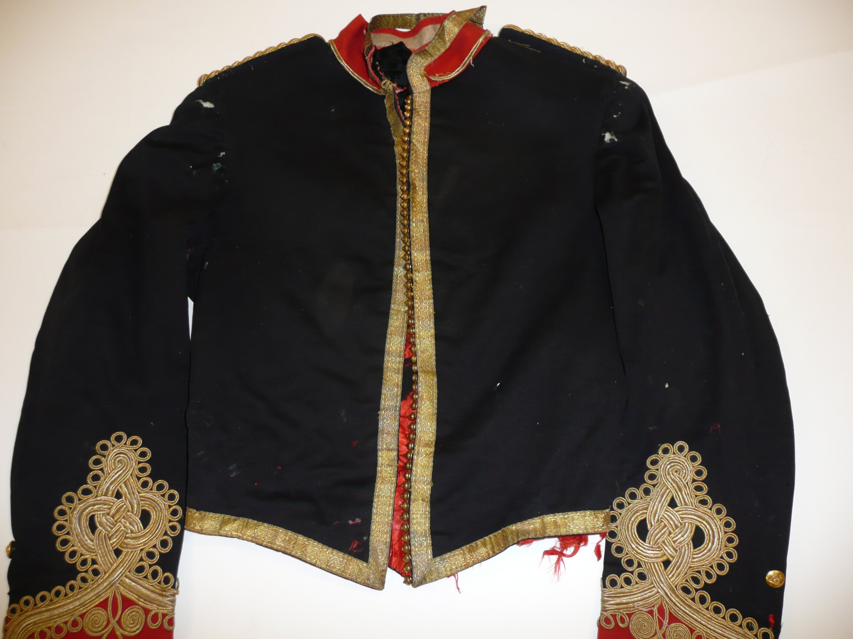 Black jacket with pointed fronts, red stand collar and cuffs. Upper edge of collar decorated with gold artillery pattern lace that extends down the fronts and lower edge of the jacket forming bull's eyes at the centre back. Lower edge of collar trimmed with narrow gold braid. Round gold cord shoulder cords of artillery pattern, each with an Artillery button. Left front edge has a row of decorative gilt studs although jacket fastens with brass hooks and eyes. Pointed cuffs edged with heavy gold braid. Lined with red silk