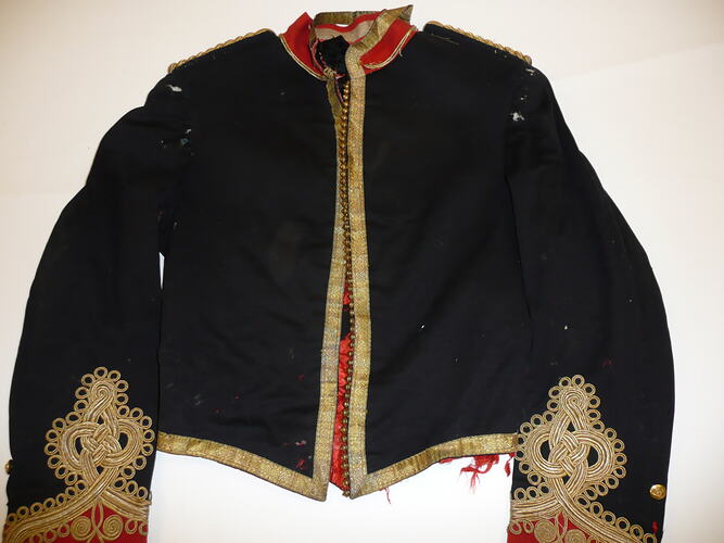 Officer's mess jacket, which was worn by Robert McKeeman Oakley, an officer in the Victorian Artillery Garrison from 1892-1901, and in the Australian Garrison Artillery from 1901. There are no identifying maker's marks.