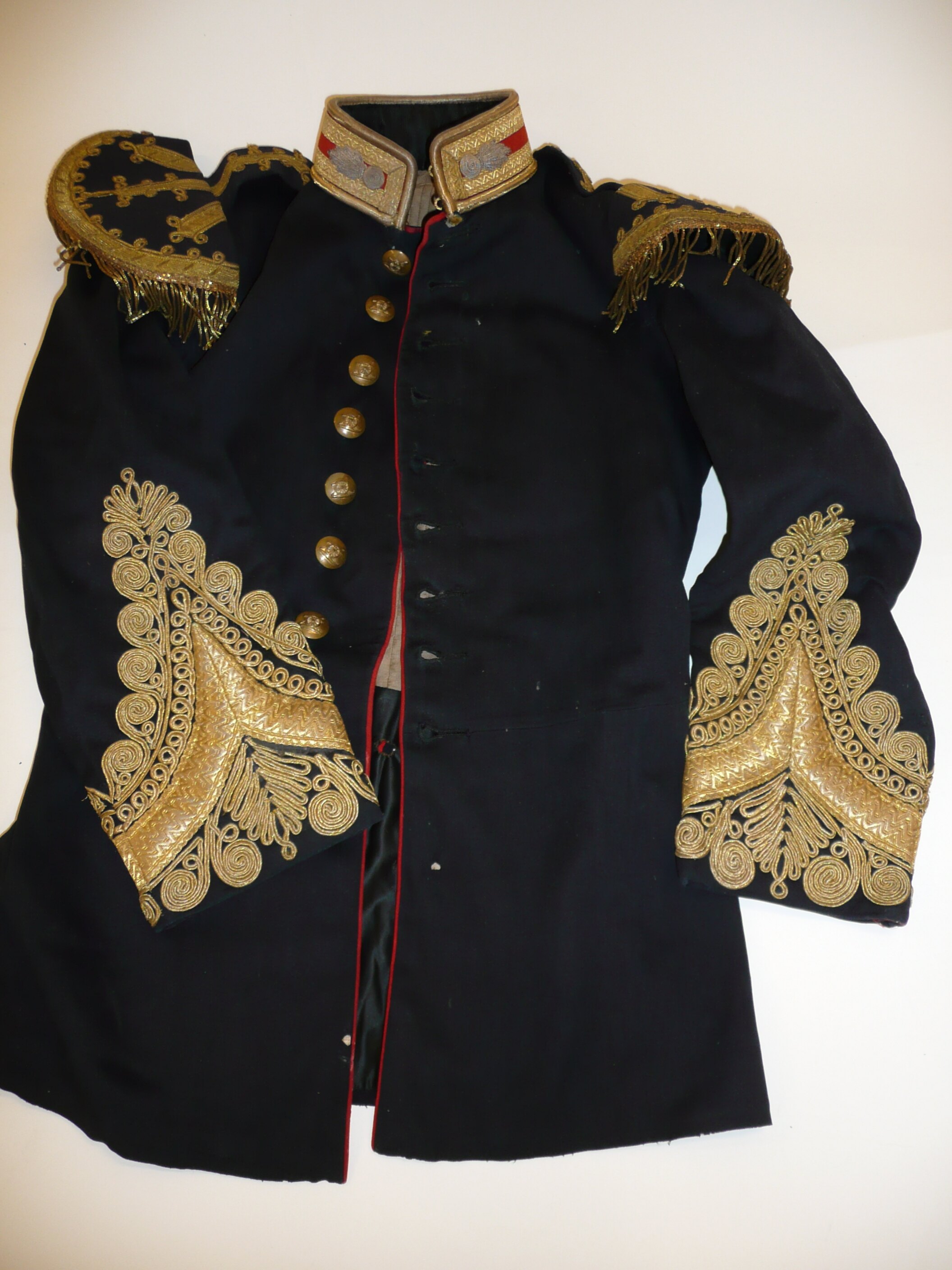 Black wool broadcloth, piped with red down the front and vent at back. Stand collar of red broadcloth and gold brocade ribbon, edged with bullion strip, two embroidered grenades in silver at neck. Shoulder pads ornately embroidered gold brocade ribbon and bullion strip. Gold bullion work at sleeves. Nine brass regimental buttons at front (Bowley & Co., Melbourne). Skirt, back, two flaps on either side of vent with two rows of bullion and three brass buttons on each flap. Two buttons at each side at top of vent. There is a single brass hook proper left at waist level to support a belt. Quilted lining inside on body of coat and black sateen lining on skirt.