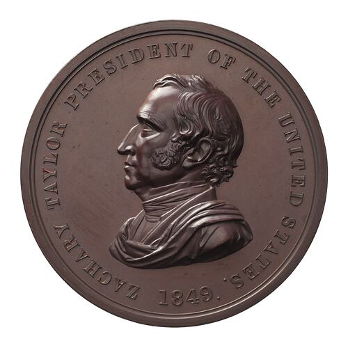 A draped bust of the President facing left; around, ZACHARY TAYLOR PRESIDENT OF THE UNITED STATES 1849