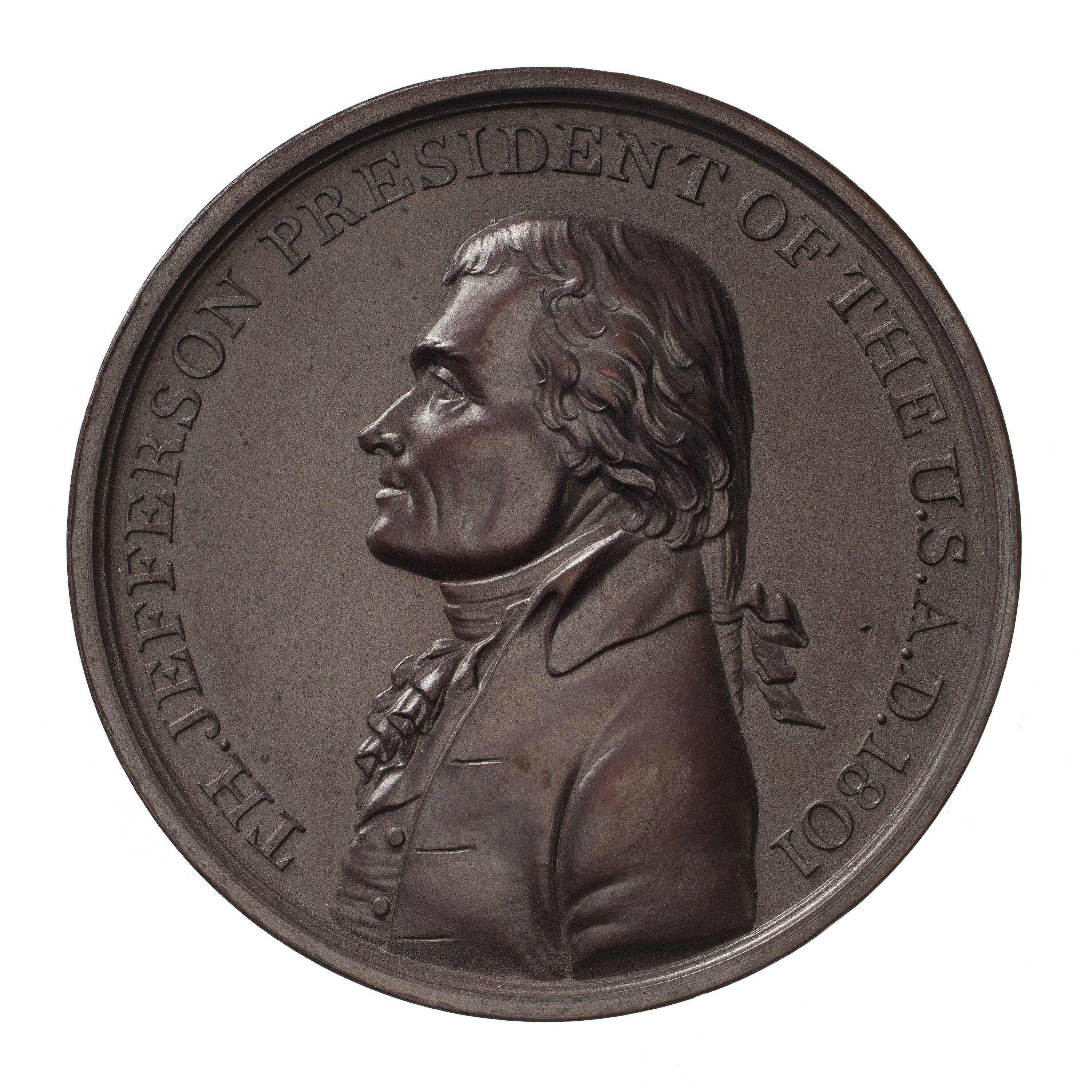 A draped bust of the President facing left; around, TH. JEFFERSON PRESIDENT OF THE UNITED STATES A.D. 1801