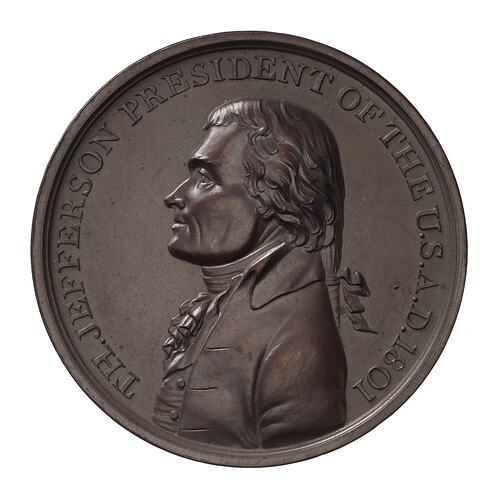 Peace Medal, American Indian, issued by President Thomas Jefferson, United States of America, 1801. This medal is also part of a series also known as Presidential Medals. Peace medals played a significant role in relations between the United States government and population Indigenous to North America (the terms Native American and American Indian are also used by government and cultural institutions in the USA).
