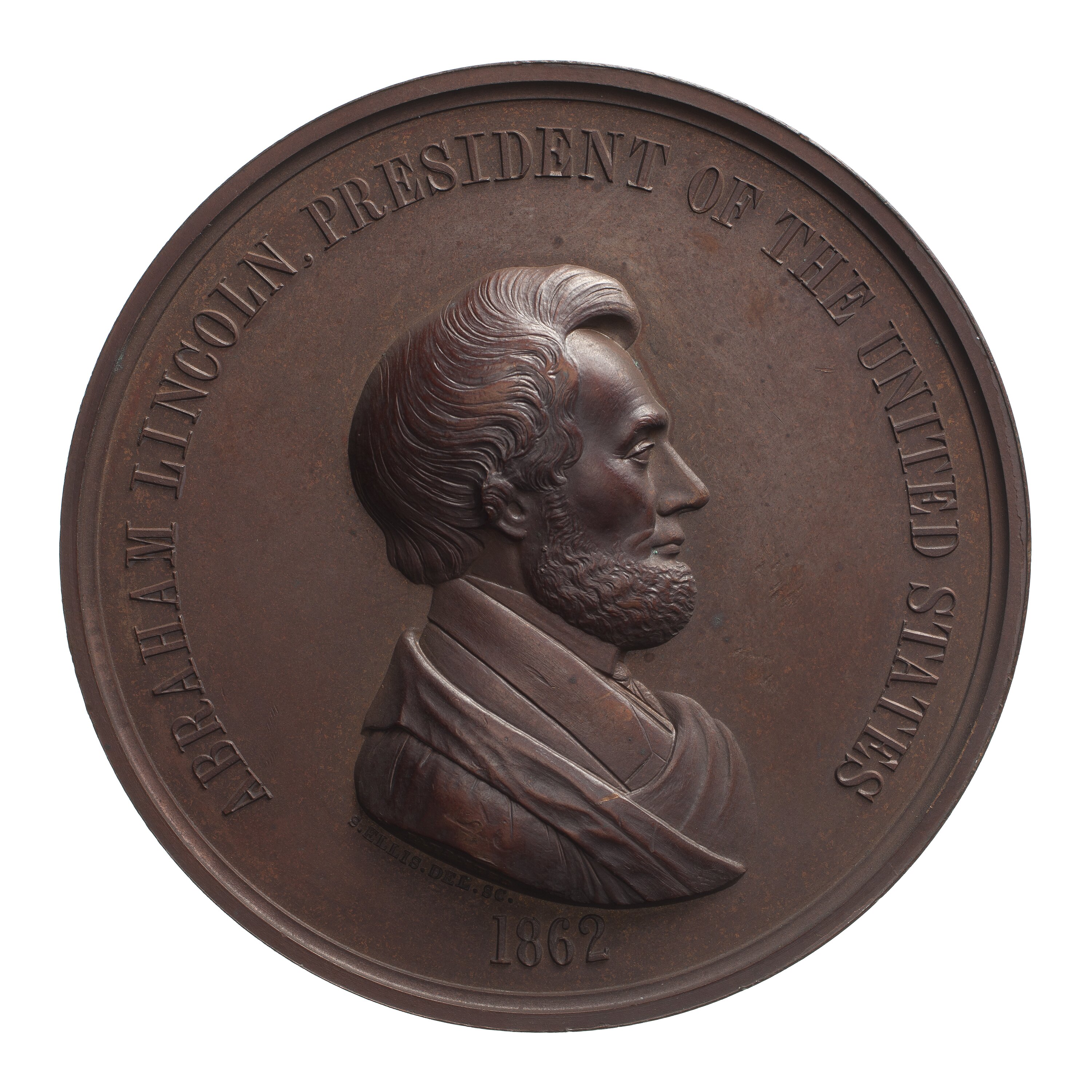 A draped bust of the President facing right; around, ABRAHAM LINCOLN PRESIDENT OF THE UNITED STATES 1862.