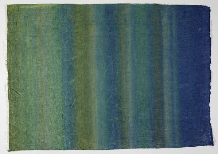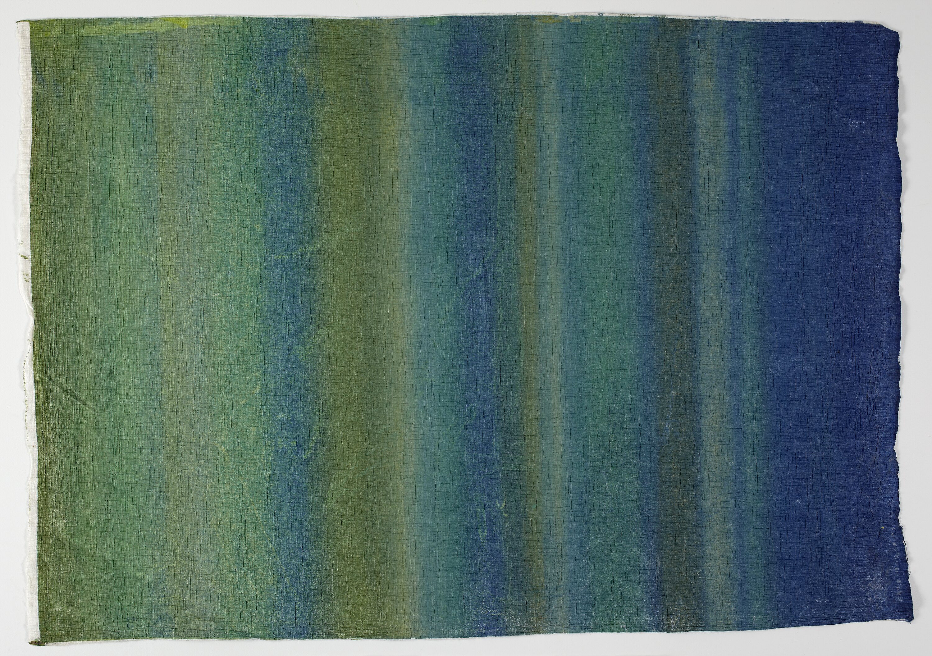 Flat piece of finely pleated and textured paper. The paper is dyed with bands of green and blue, which bleed into each other.