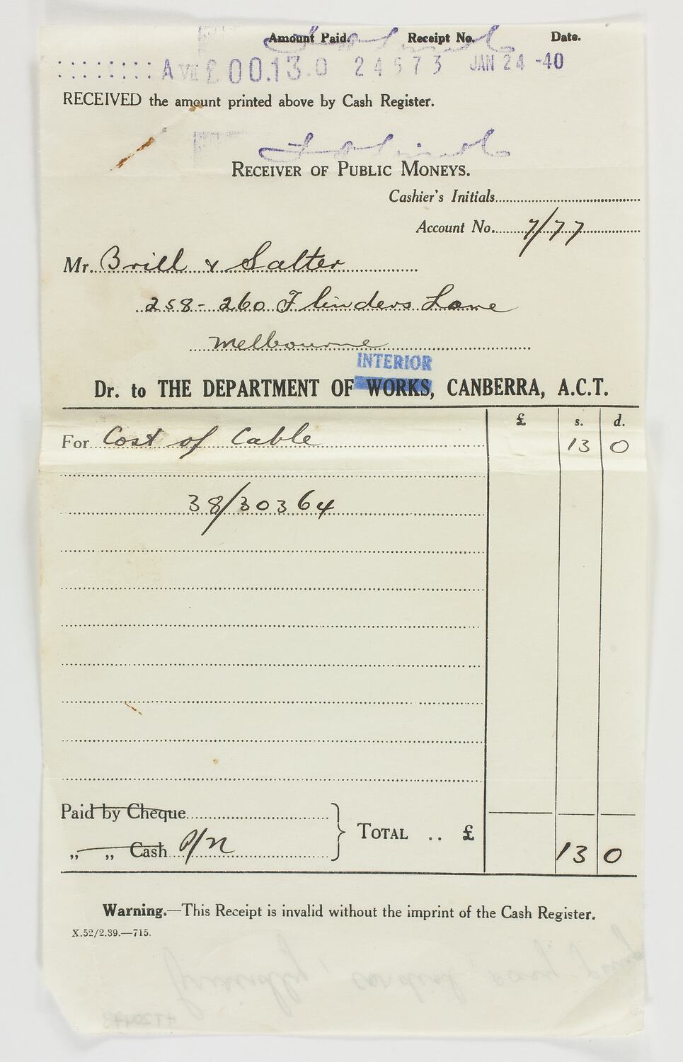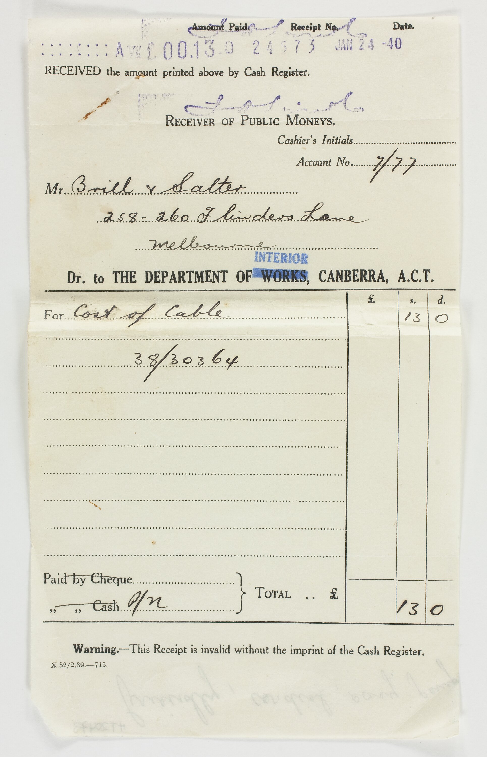 Text, printed: RECEIVED the amount printed above by Cash Register/RECEIVER OF PUBLIC MONIES/Cashier's Initials/Account No.Mr. Brill & Salter/258-260 Flinders Lane/Melbourne/Dr. to THE DEPARTMENT OF INTERIOR, CANBERRA A.C.T./For Cost of Cable.