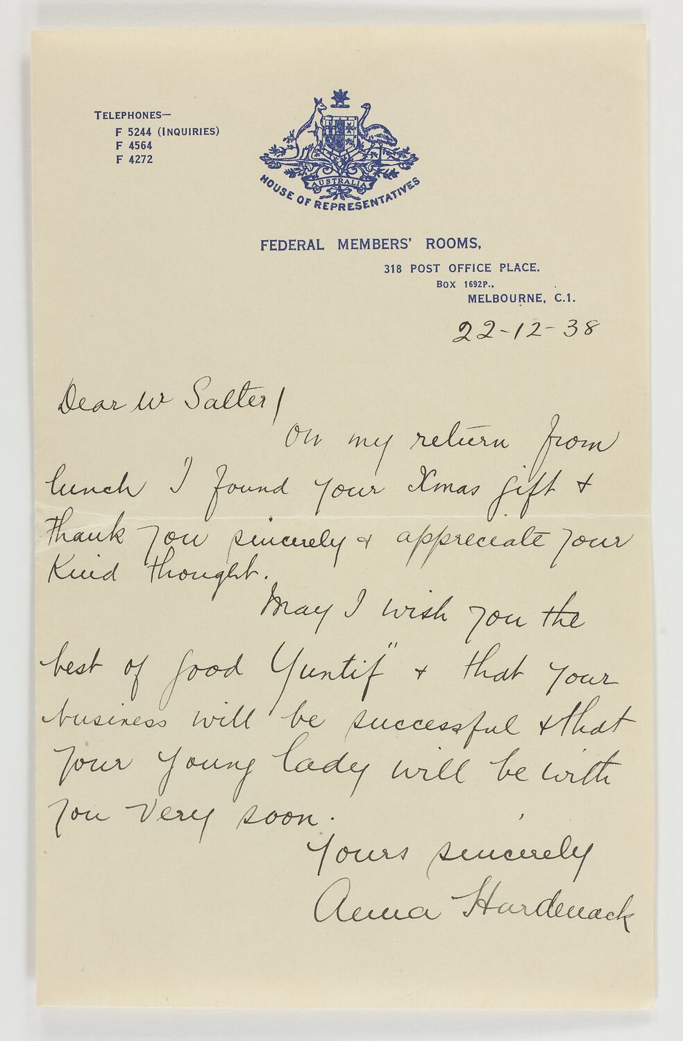 Folded letter hand written on one half only, headed Federal Members Room, House of Representatives, from Anna Hardmack to Robert Salter, Carlton, dated 22 December 1938.