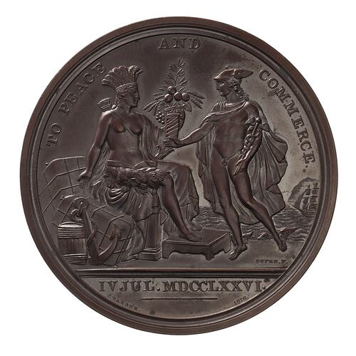 America (as an Indian Princess) seated among bales, an anchor etc. and holding a cornucopia welcomes Mercury, standing facing left wearing cape and winged cap, in the background, a sailing ship; around above, TO PEACE AND COMMERCE; in exergue, IV JULY MDCCLXXVI; in small letters below, C. BARBER 1876; the name of the original artist, DUPRE F. , below Mercury.
