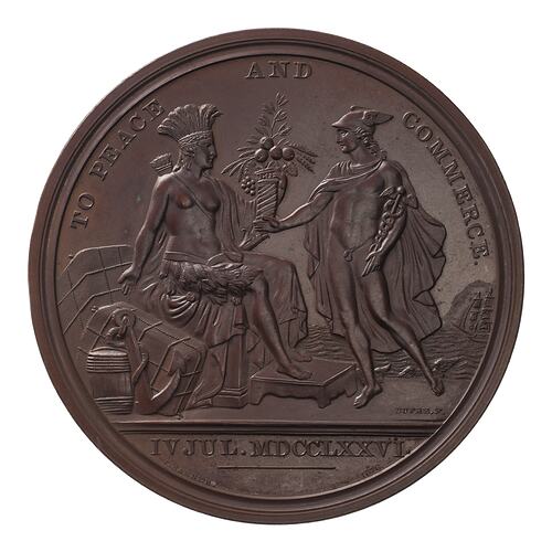 America (as an Indian Princess) seated among bales, an anchor etc. and holding a cornucopia welcomes Mercury, standing facing left wearing cape and winged cap, in the background, a sailing ship; around above, TO PEACE AND COMMERCE; in exergue, IV JULY MDCCLXXVI; in small letters below, C. BARBER 1876; the name of the original artist, DUPRE F. , below Mercury.