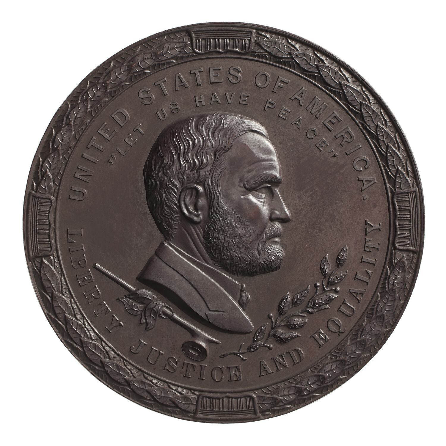 A draped bust of the President facing right above an Indian peace pipe and olive branch; around, UNITED STATES OF AMERICA / "LET US HAVE PEACE" LIBERTY JUSTICE EQUALITY.