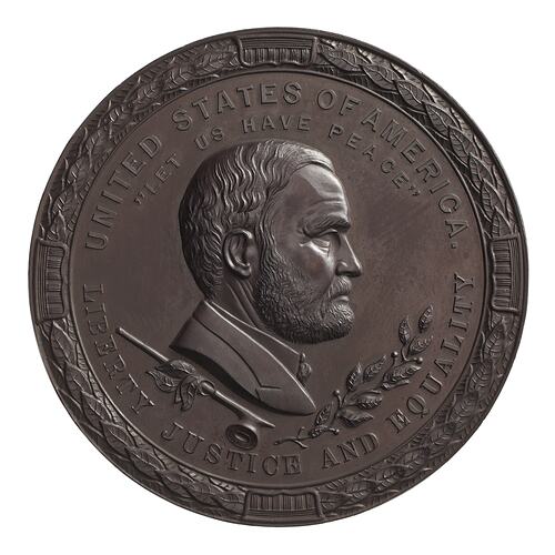 Peace Medal, American Indian, issued by President Ulysses S. Grant, United States of America, 1871. This medal is a copper strike presented to the Museum by the US Government pre-1924, possibly at an International Exhibition. Peace medals played a significant role in relations between the United States government and the population Indigenous to North America (the terms Native American and American Indian are also used by government and cultural institutions in the USA).