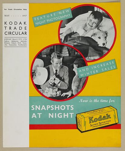 Colour Kodak Trade Circular brochure from May 1937, promoting a new campaign for 'night photography', 'Snapshots at Night'. The brochure, designed for distribution to Kodak dealers and retailers around Australia, lists different products and costs, including flashbulbs, reflectors, film, and promotional posters.