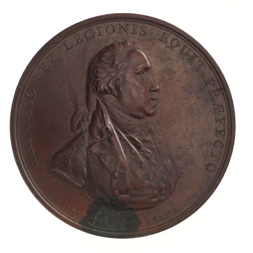 A draped bust of Lee facing right; around, HENRICO LEE LEGIONIS EQUIT. PRAEFECTO; below in small letters COMMITIA AMERICANA; on bust truncation, the artist's name, J. WRIGHT.
