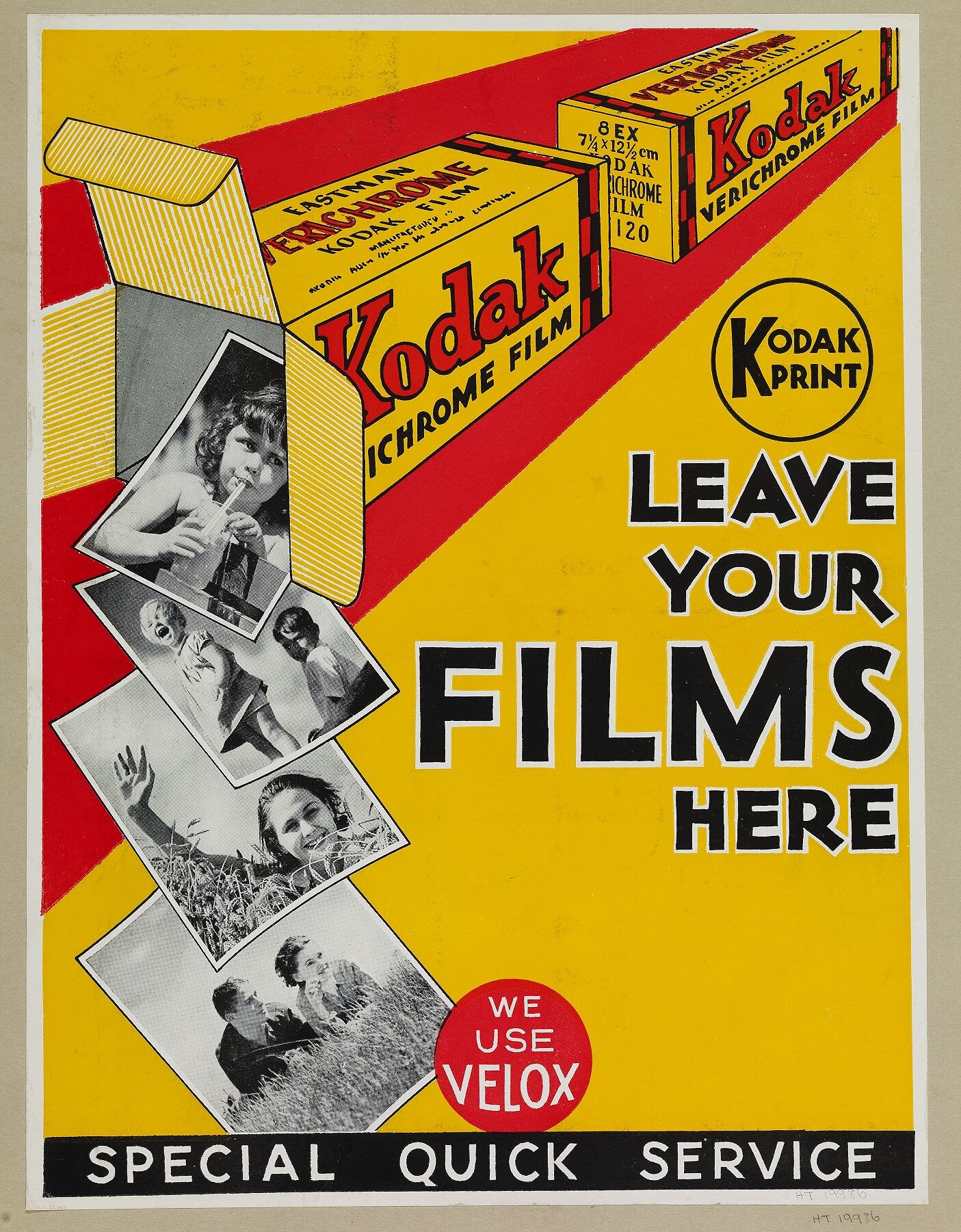 Front, printed: '[text on film box illustrations] / KODAK / PRINT / LEAVE / YOUR / FILMS / HERE / WE / USE / VELOX / SPECIAL QUICK SERVICE'