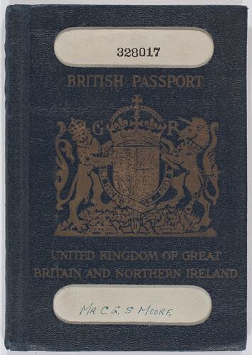 Text, front cover: '328017 / BRITISH PASSPORT / UNITED KINGDOM OF GREAT / BRITAIN AND NORTHERN IRELAND / MR. C.G.S. MOORE.'