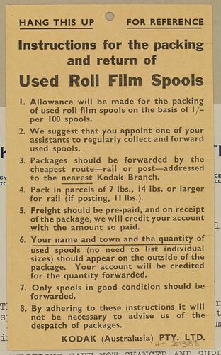 Text, black ink, printed: HANG THIS UP FOR REFERENCE / Instructions for the packing / and return of / Used Roll Film Spools / [extensive text]
