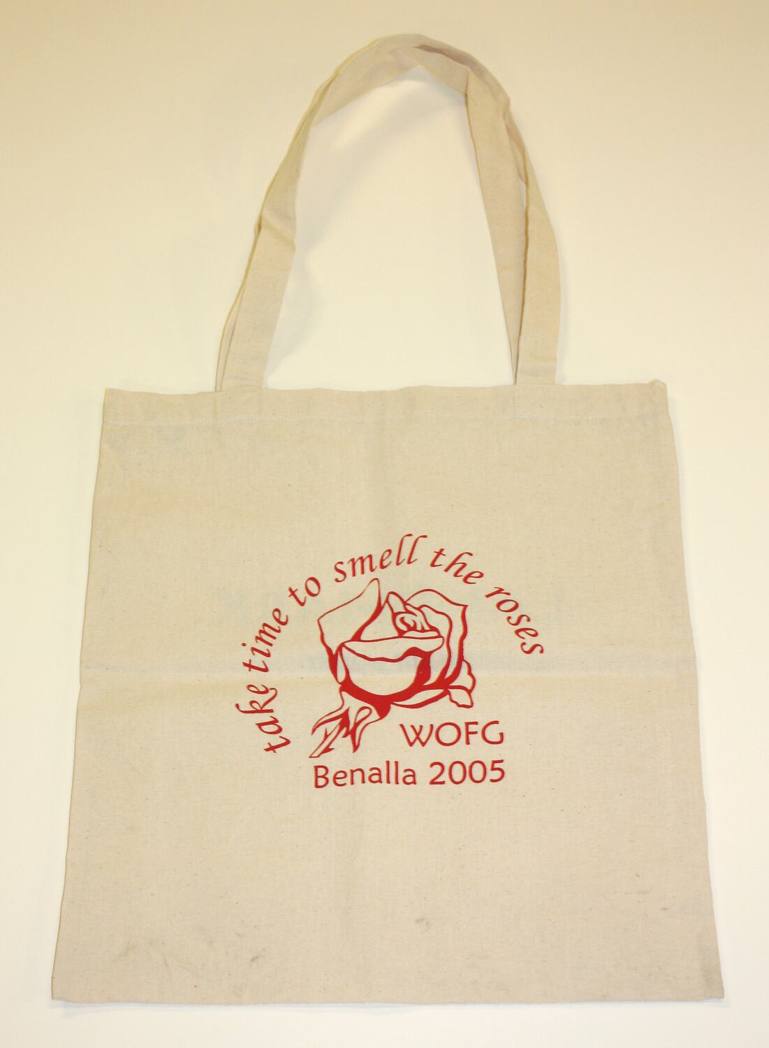 Cloth carry bag used by delegates at the 2005 Benalla Women on Farms Gathering. This bag was distributed to participants of the Gathering upon arrival and registration. It contained a number of flyers from sponsors and details of the weekend events and local attractions.