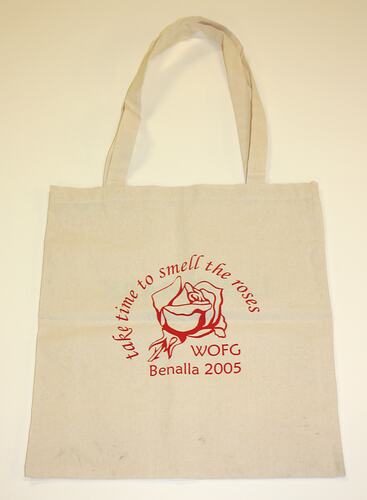 A key feature that unites all Victorian Women on Farms Gatherings is the tradition of giving gifts and souvenirs to participants. These gifts are usually sourced from the region that the Gathering is held and include local foodstuffs, pamphlets and handcrafted goods. They are usually handed to participants at the beginning of the Gathering during registration, and are often contained within a bag, such as this 2005 Benalla Gathering bag. This tradition of gift-giving allows the local organising committee to showcase their region's produce, as well as to make their guests feel welcome from the outset of the Gathering weekend.