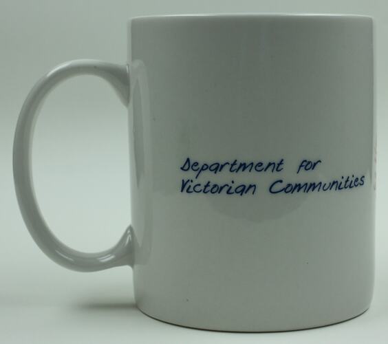 This mug was given to all participants at the 2005 Benalla Women on Farms Gathering. A key feature that unites all Victorian Women on Farms Gatherings is the tradition of giving gifts and souvenirs to participants. These gifts are usually handed to participants at the beginning of the Gathering during registration, and range from practical items - such as this mug - to other assorted items that are associated with the region that the Gathering is held, such as local foodstuffs and handcrafted goods. This tradition of gift-giving allows the local organising committee to showcase their region's produce, as well as to make their guests feel welcome from the outset of the Gathering weekend.