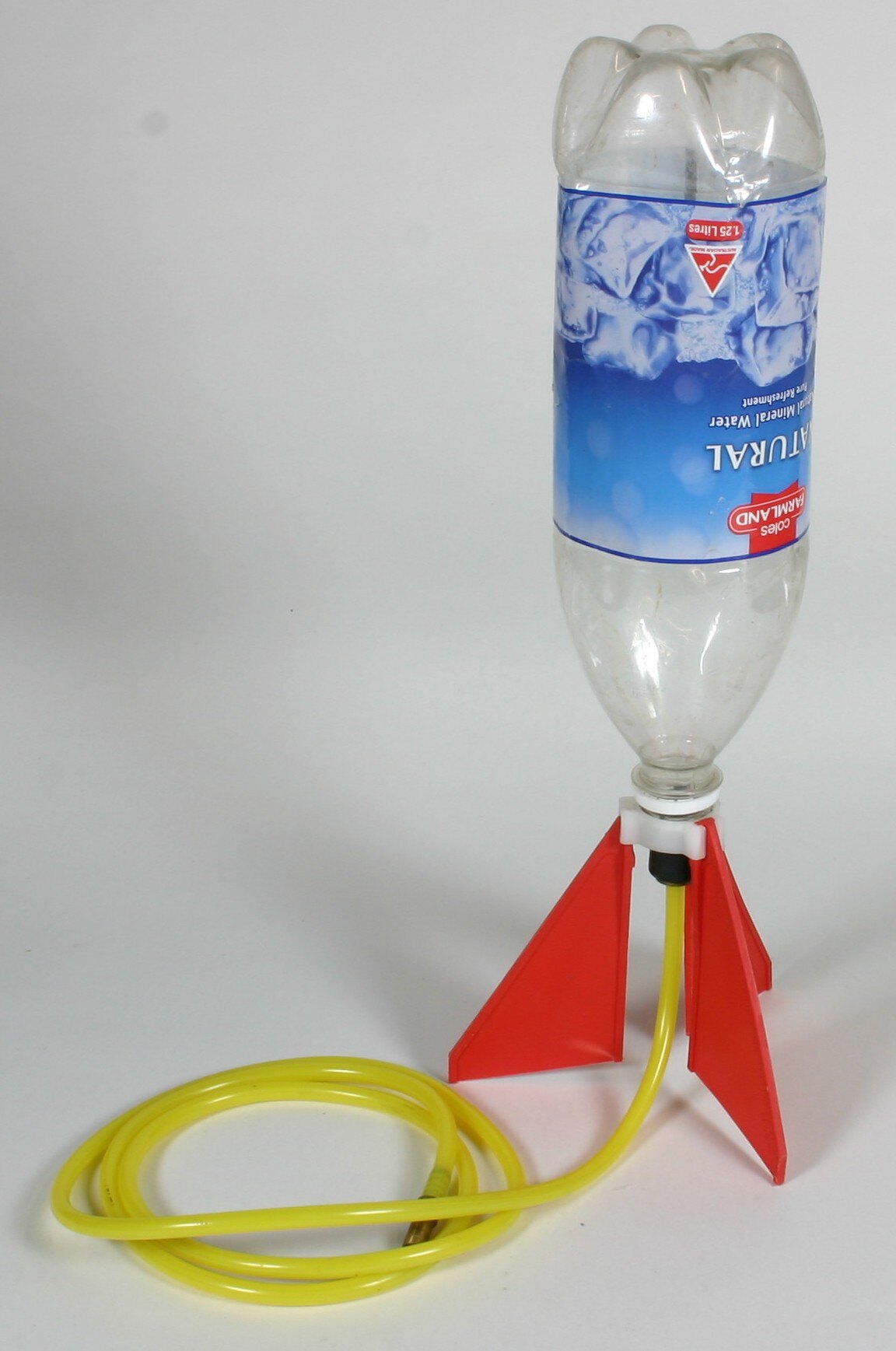 Toy water rocket attached to generic water bottle.