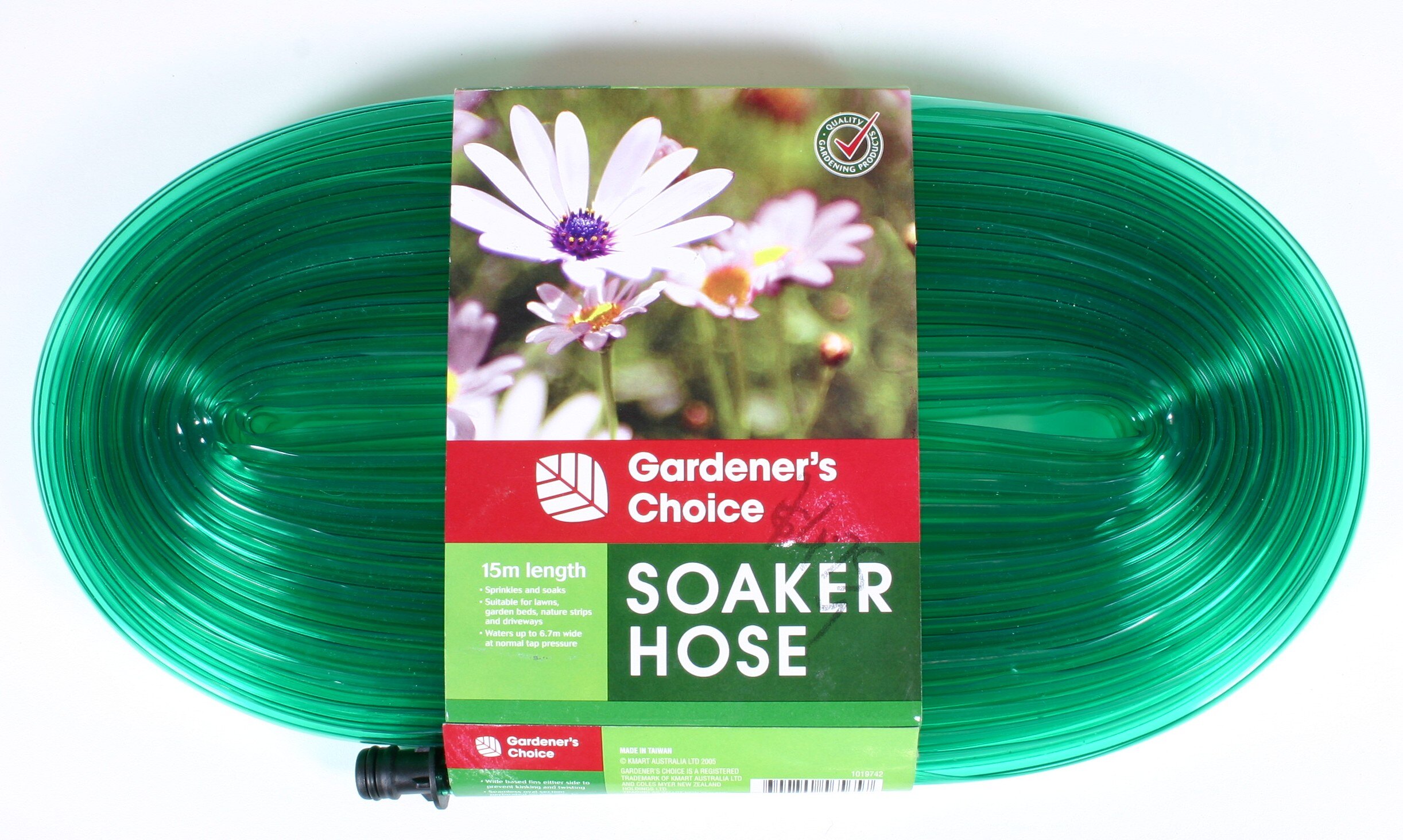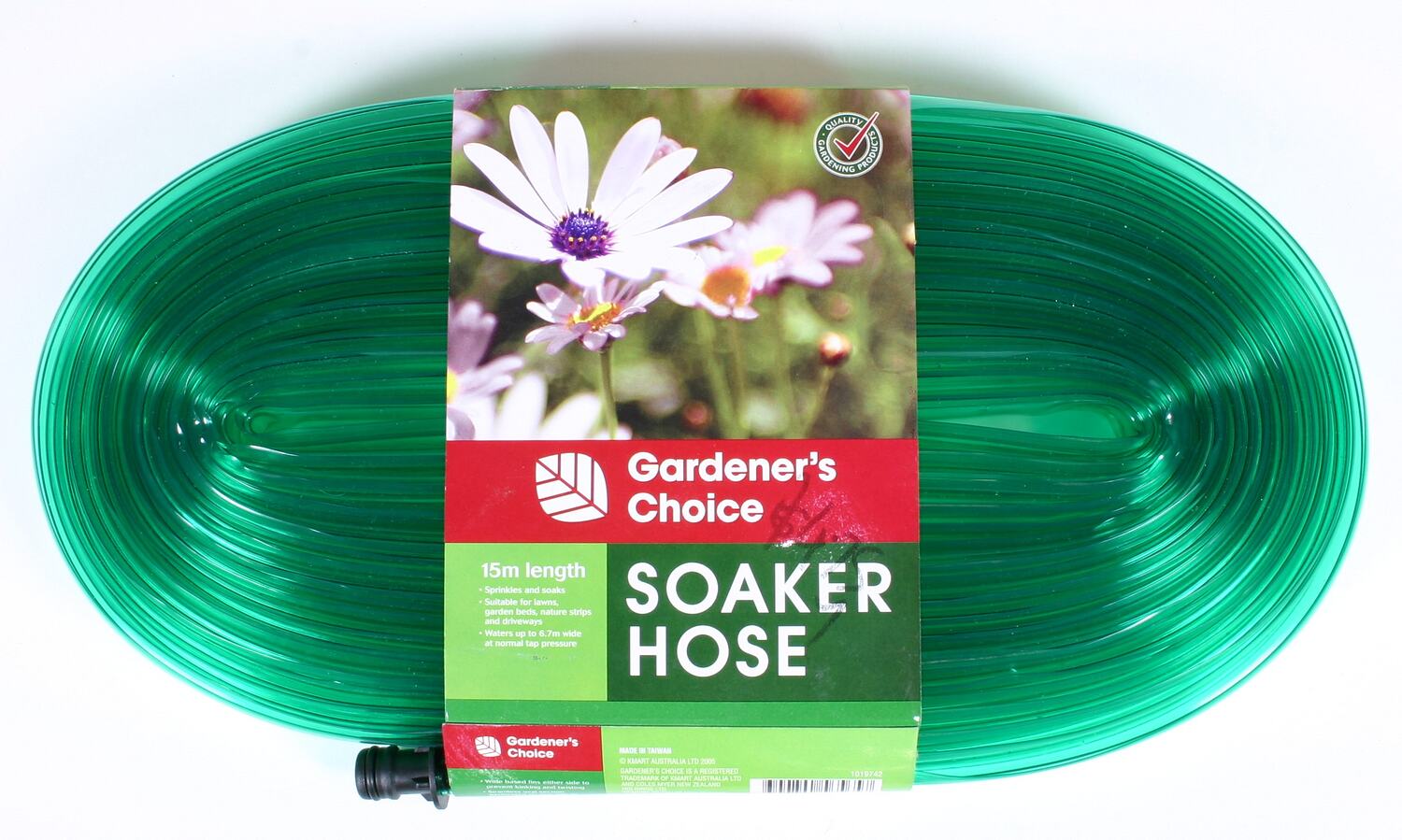 Printed on cardboard label: "Gardener's Choice / SOAKER HOSE / 15m length / Sprinkles and soaks / Suitable for lawns, garden beds, nature strips and driveways / Waters up to 6.7m wide at normal tap pressure... (and further associated text) ... MADE IN TAIWAN / Copyright KMART AUSTRALIA LTD 2005..." and further text. Handwritten, black marker pen, front: "$4.75".