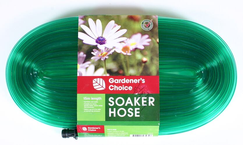 This garden hose was acquired as part of the Museum Victoria 'Curator for a Day project', undertaken in October 2007. The garden hose was manufactured by Gardner's Choice, a registered trademark of the Australian retailer K Mart. It is a soaker hose designed for watering a domestic garden.
