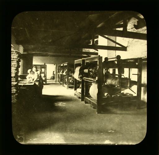 Room interior, two boys using mat-making equipment. Machinery along left wall.