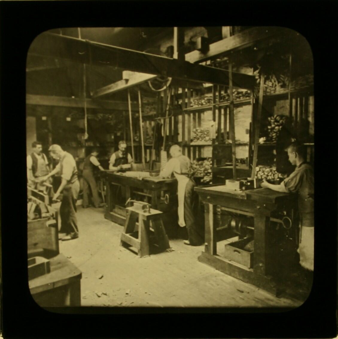 Room interior, seven men working with wood on tables. Piles of wood and equipment against walls and on shelves.