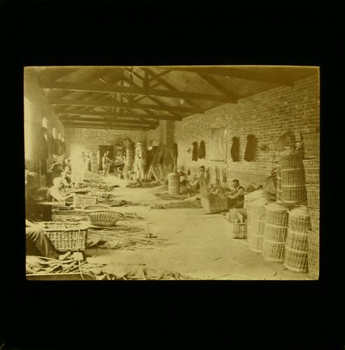 Interior, approximately ten men standing and seated, with baskets, chests and other items of canework.