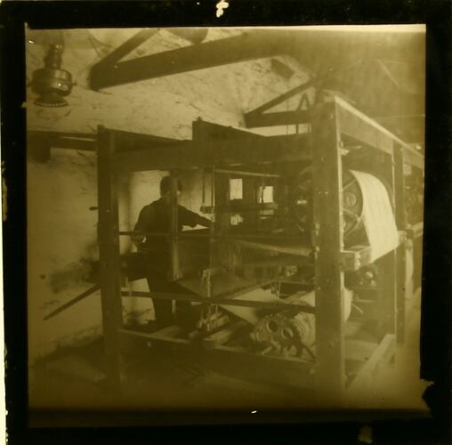 Damaged. Standard format (3¼ x 3¼ inch square) lantern slide, comprising black & white photographic image printed on glass with black paper rectangular mask against image under protective glass cover plate; sealed with black paper binding tape around edge. White paper label adhered to front.