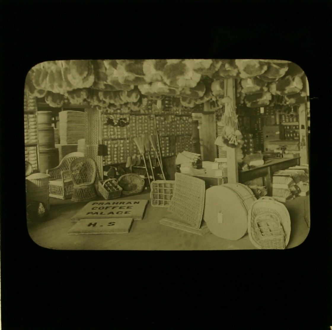 Interior, containers stacked along walls. Shop interior displays items made by visually-impaired people at the Royal Victorian Institute for the Blind (RVIB). Mats, broomsticks and baskets in foreground. Text on mat on floor, "PRAHRAN / COFFEE / PALACE / H - S".