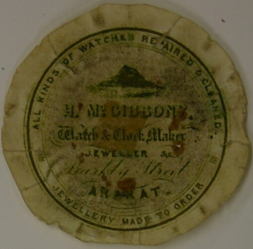 Watch paper produced by H. McGibbony watchmaker in Ararat, Victoria in 1872.