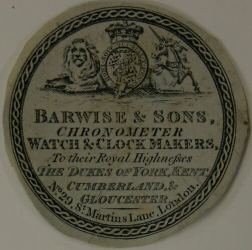 Front, "BARWISE & SONS, / CHRONOMETER / WATCH & CLOCK MAKERS, / To their Royal Highnefses / THE DUKES OF YORK, KENT, / CUMBERLAND, & / GLOUCESTER / No. 29 St. Martins Lane, London.".