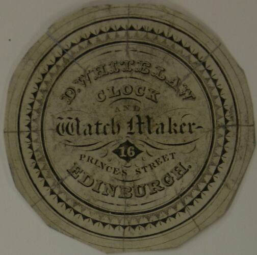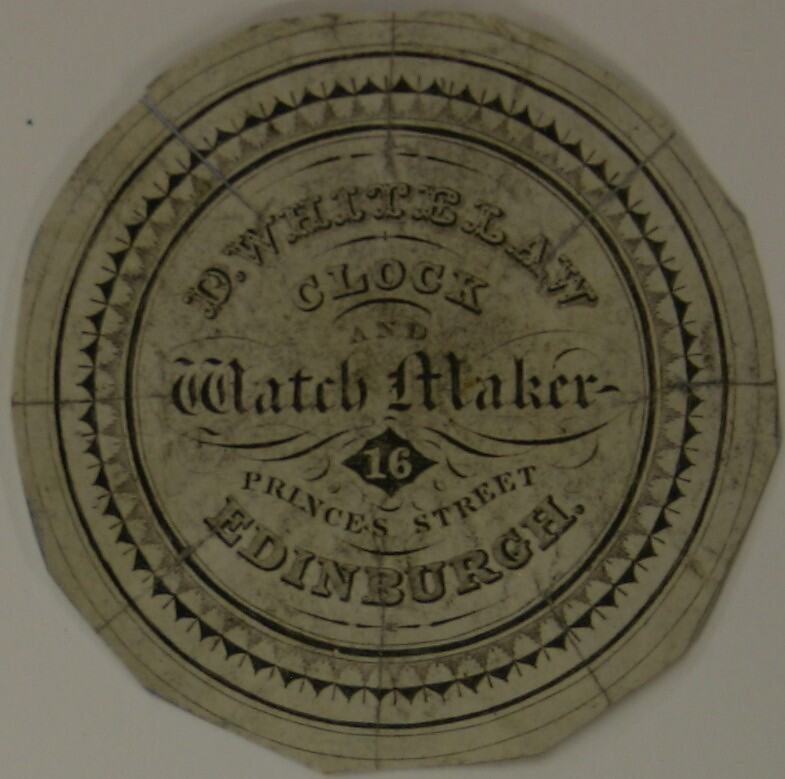 Front, "D. WHITELAW / CLOCK / AND / Watch Maker / 16 / PRINCES STREET / EDINBURGH.". Reverse, handwritten, "1815-25".